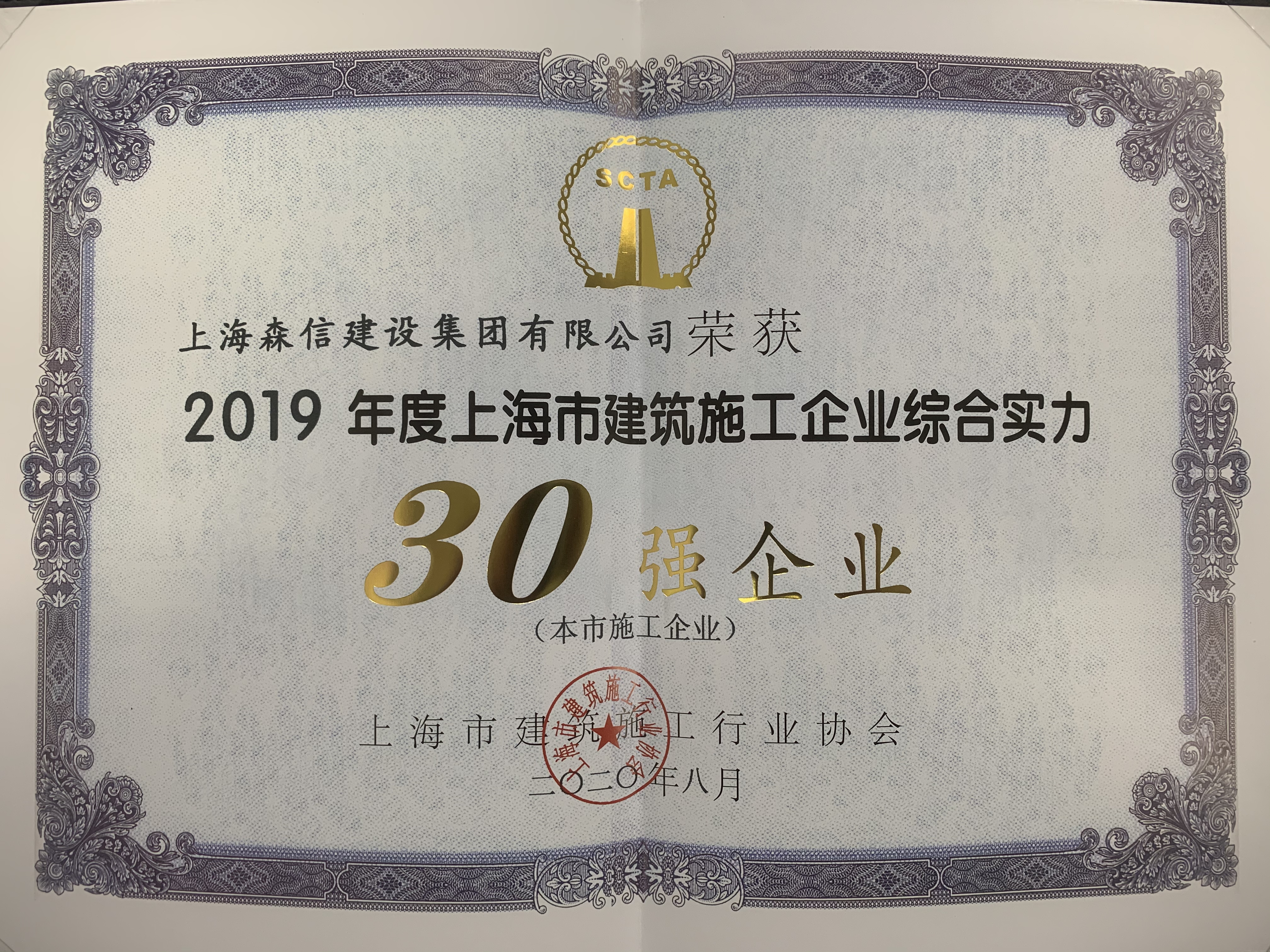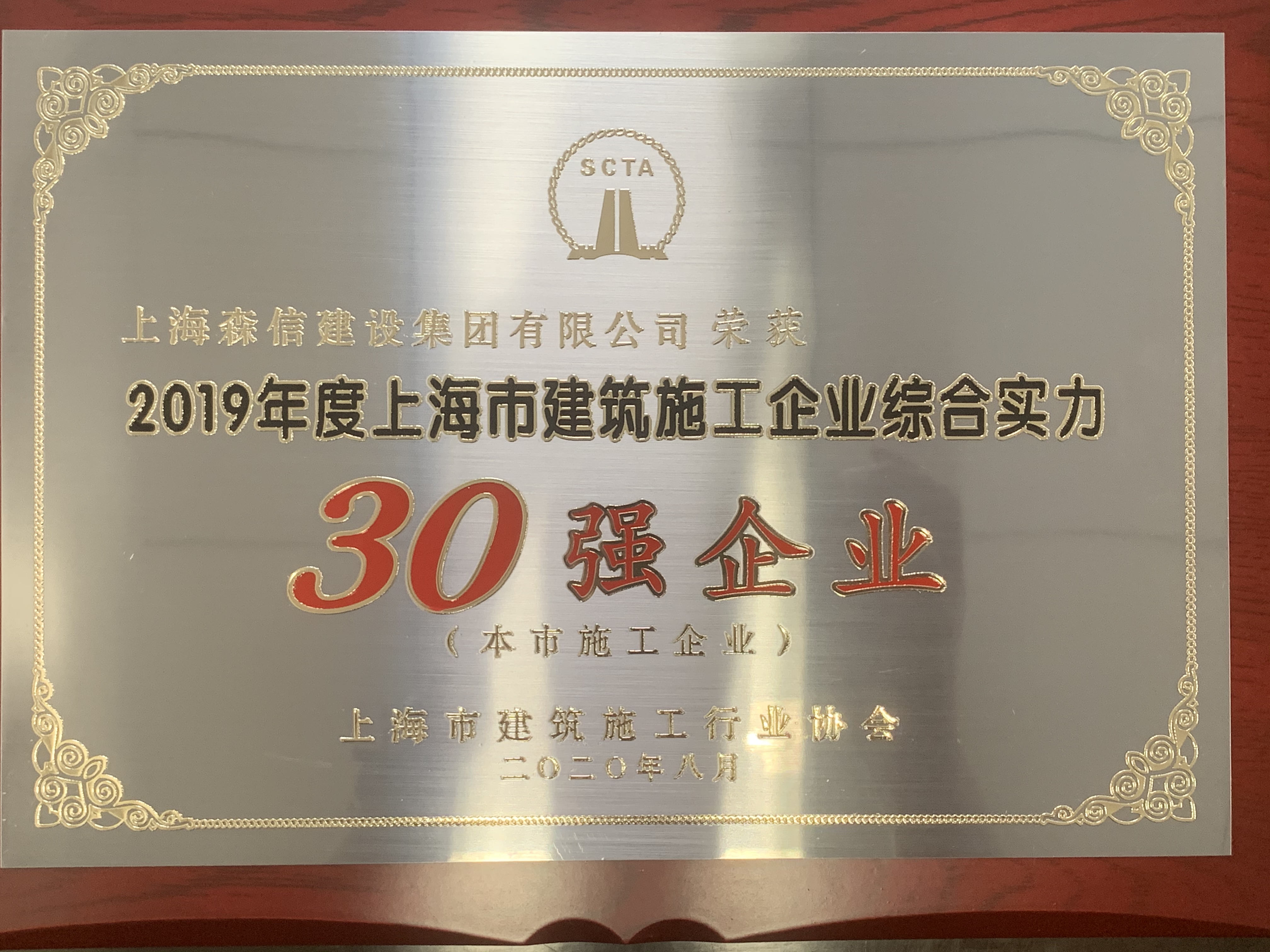 近日,經(jīng)上海市建筑施工企業(yè)綜合實(shí)力排名審定委員會(huì)審定,我司再度榮獲“2019年度上海市建筑施工企業(yè)綜合實(shí)力30強(qiáng)企業(yè)”稱號(hào)。