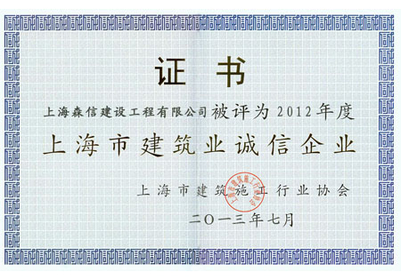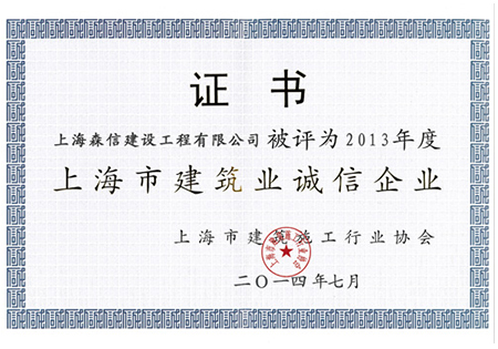 2014年8月榮獲2013年度上海市建筑業(yè)誠信企業(yè)