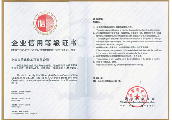 2010年11月榮獲全國建筑業(yè)信用等級AAA級企業(yè)