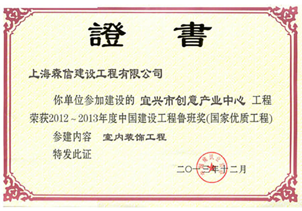 2013年12月宜興市創(chuàng)意產(chǎn)業(yè)中心工程獲得“中國建設(shè)工程魯班獎”