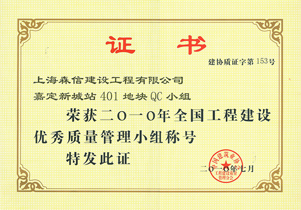 2010年7月嘉定新城站401地塊QC小組榮獲2010年全國工程建設(shè)優(yōu)秀質(zhì)量管理小組稱號