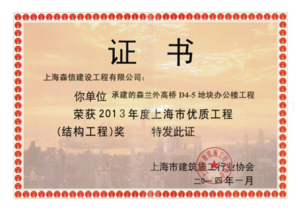 2014年森蘭外高橋D4-5地塊辦公樓榮獲全國工程建筑優(yōu)秀項目管理二等獎