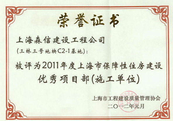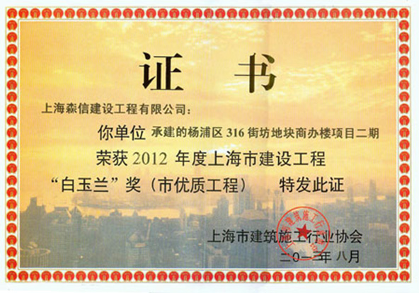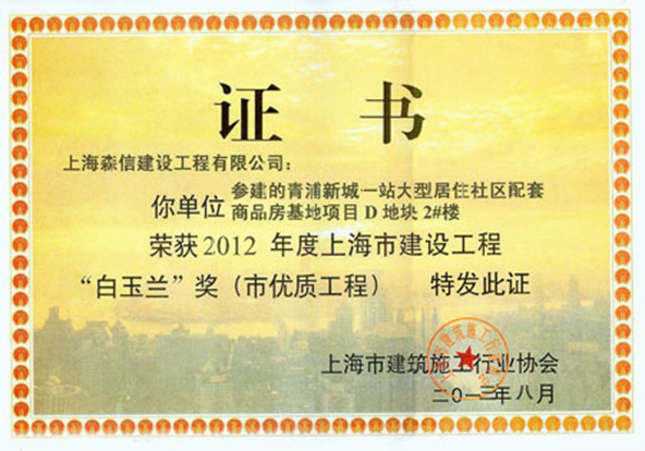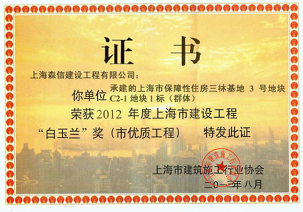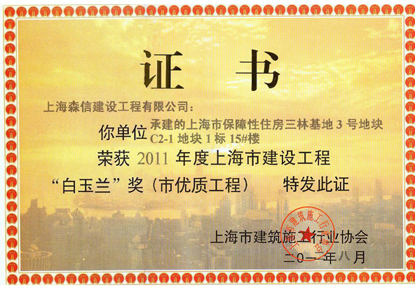 2012年8月上海市保障性住房三林基地15#樓榮獲白玉蘭獎