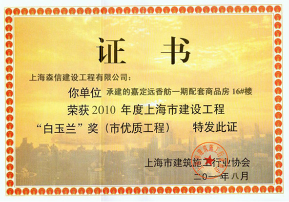 2011年8月嘉定遠(yuǎn)香坊一期配套商品房16#樓榮獲上海市“白玉蘭”獎(市優(yōu)質(zhì)工程)