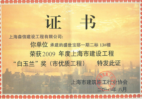 2010年5月盛世寶邸一期二標(biāo)13#樓榮獲2009年度上海市“白玉蘭”獎