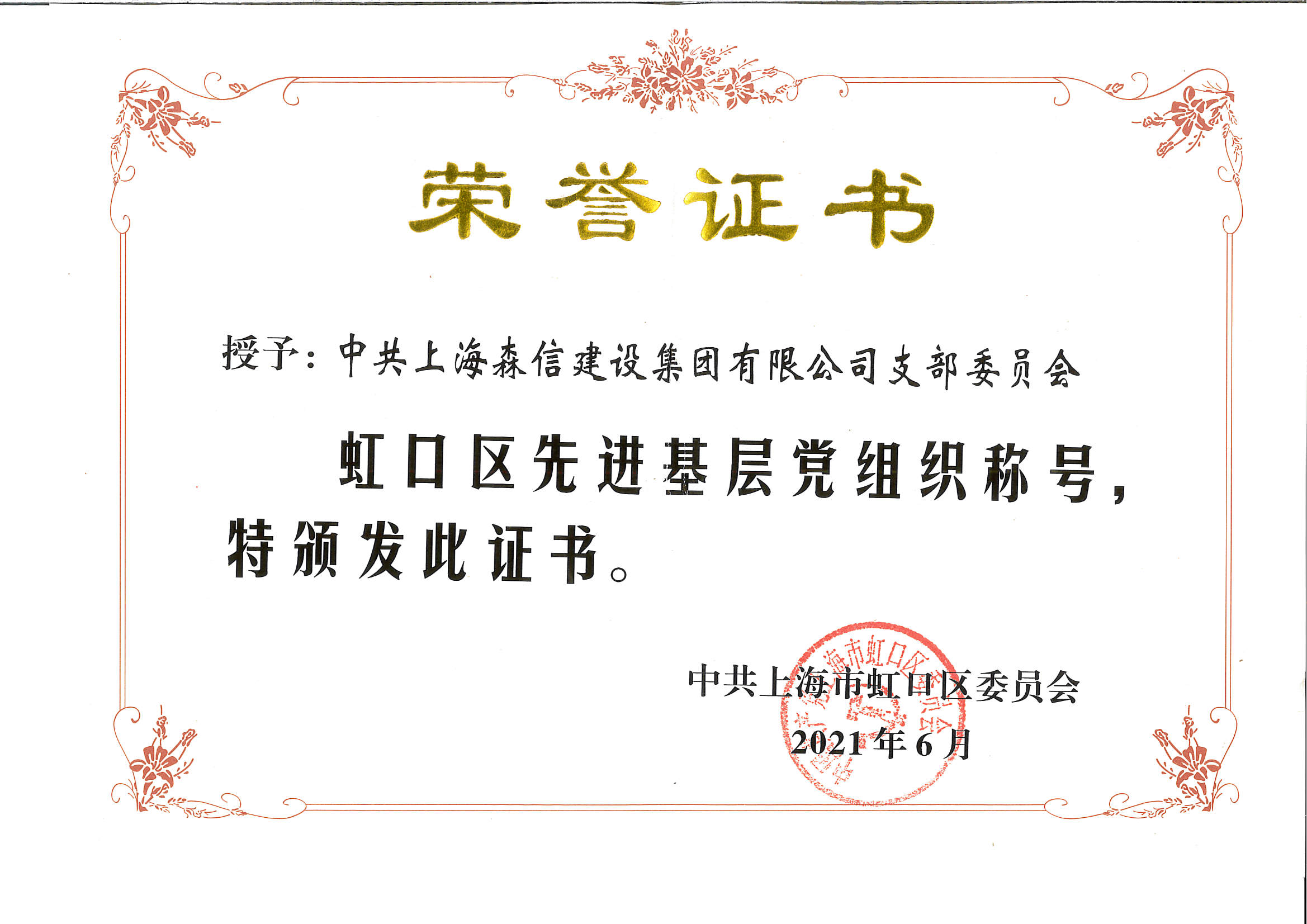近日,中共上海森信建設(shè)集團公司支部委員會獲評“虹口區(qū)先進基層黨組織”。在建黨一百周年之際,這份榮譽是對我司黨建工作至高褒獎,是對工作不足的鞭策,更為我支部后續(xù)黨建群團工作順利開展注入了不竭動力。