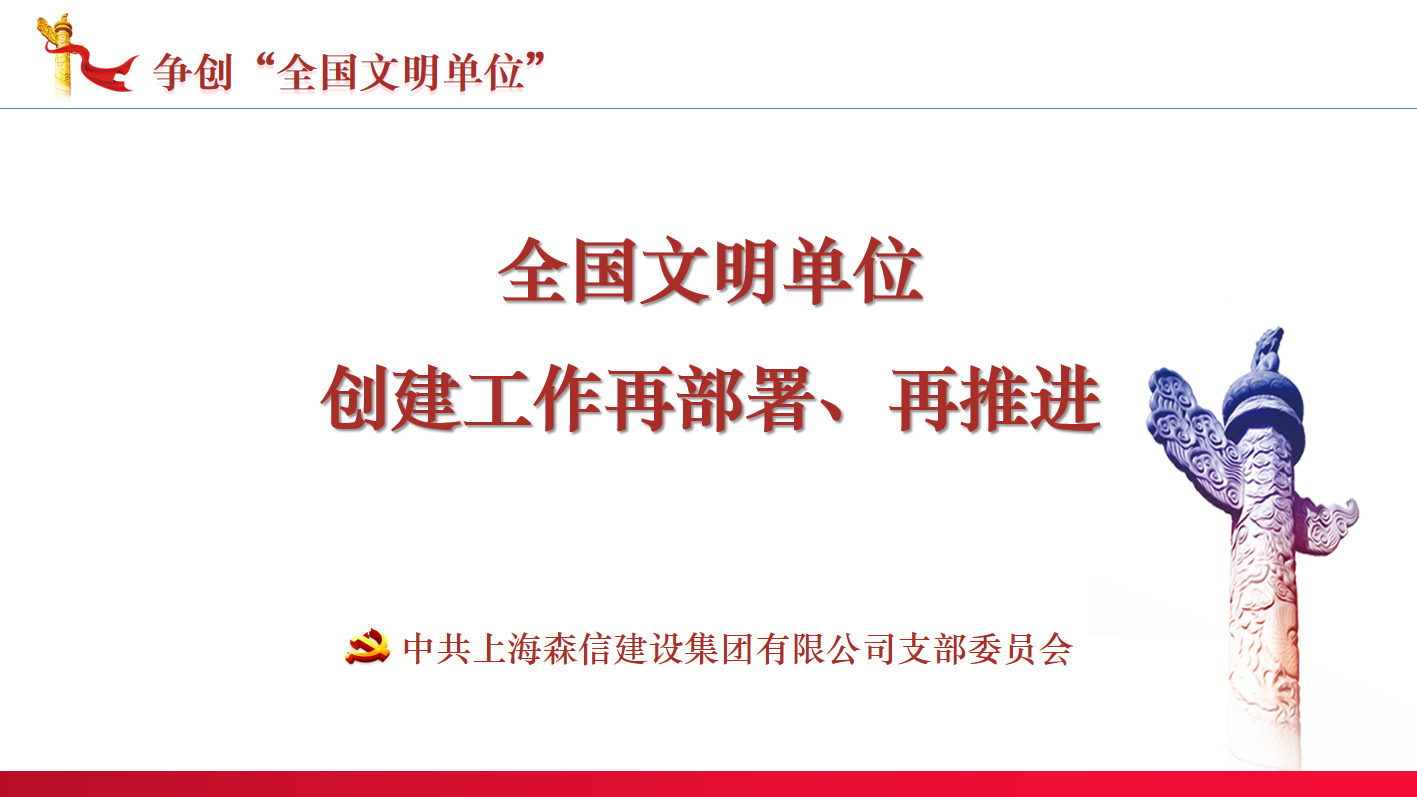 為進(jìn)一步深化認(rèn)識、統(tǒng)一思想、明確目標(biāo)、齊心協(xié)力做精、做細(xì)、做實全國文明單位創(chuàng)建工作,以實際行動迎接黨的二十大勝利召開,近日,森信集團(tuán)黨支部組織全體黨員召開專題會議就公司全國文明單位創(chuàng)建工作進(jìn)行再部署、再推進(jìn)。